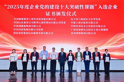 在证书颁发环节,中国企业改革与发展研究会副会长范建林宣读了《关于2025年度企业党的建设优秀课题入选决定》,彭华岗为“2025年度企业党的建设十大突破性课题”企业代表颁发入选证书,中盐上海公司党委书记黄庆红上台领奖。